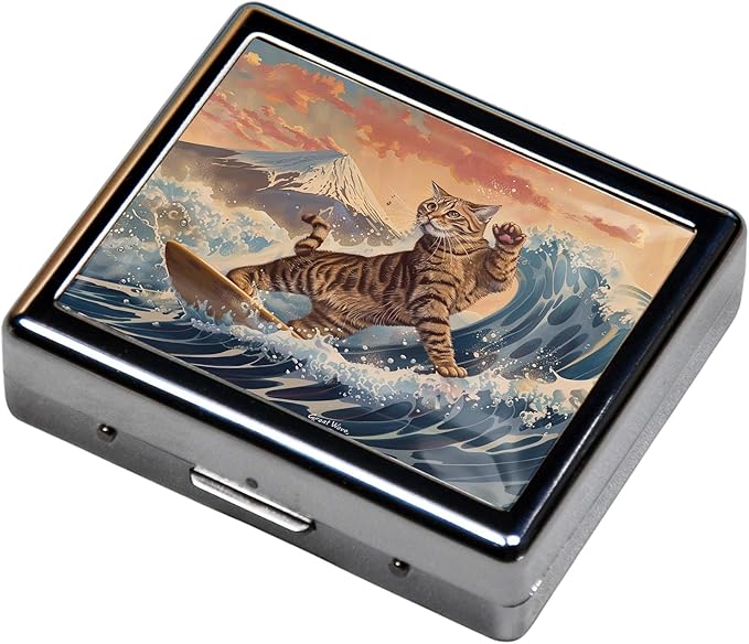 7 Days Chromed Shiny Silver Pill Organizer with Mirror Inside Has 8 Separate Compartments Rectangle Cute Travel Pill Organizer for Purse 7 Days (Surfer cat)