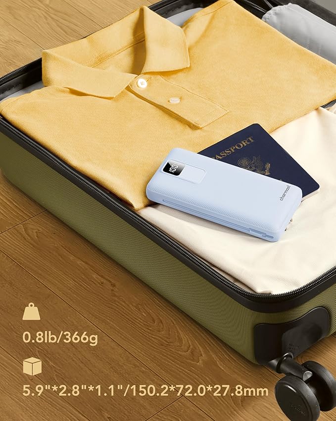 - Compact and Durable Design: Combining power with portability, the Charmast Power Bank weighs about 12.99 ounces. Its fully rubberized cover not only provides a comfortable grip but also offers reliable protection against scratches and accidental drops.
