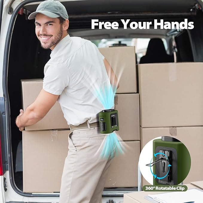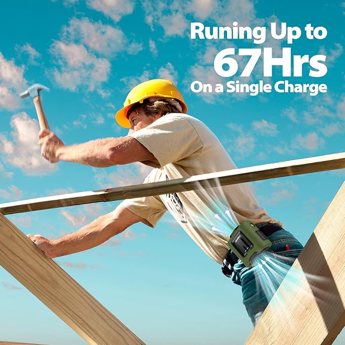 - 67 Hours Long Battery Life: This portable waist fan packs a rechargeable 14500mAh battery, delivering 6 to 67 hours cooling on a single charge. Fully recharges just in 6.5 hours, Perfect for work, job sites, camping, fishing, hiking, or travel