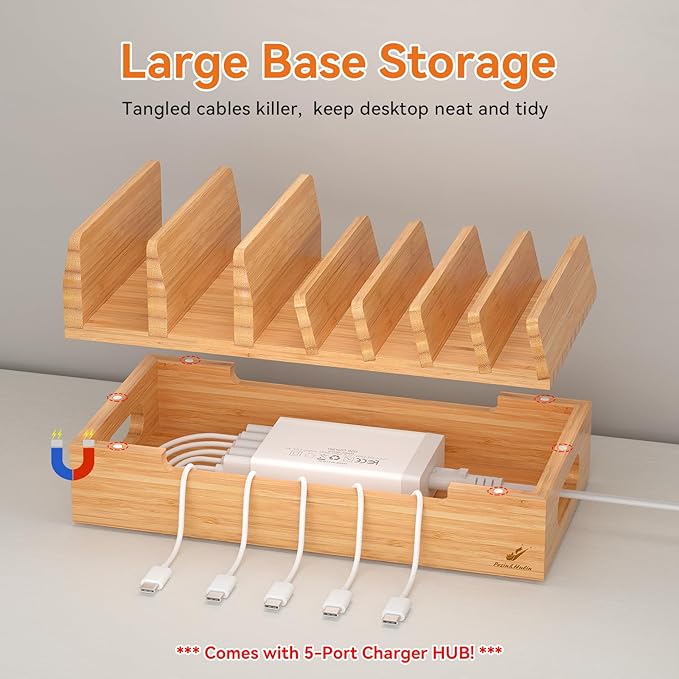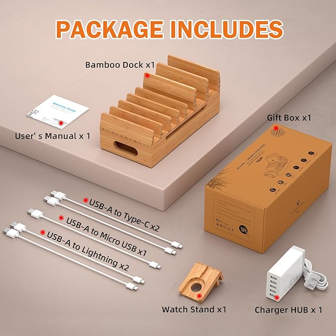 - Compatible with Multiple Devices: The bamboo charging station with Watch Dock Stand, is designed to charge up to your 7 devices simultaneously, matching to the universal cell phones, tablet, E-reader, and more devices no matter how thick case on