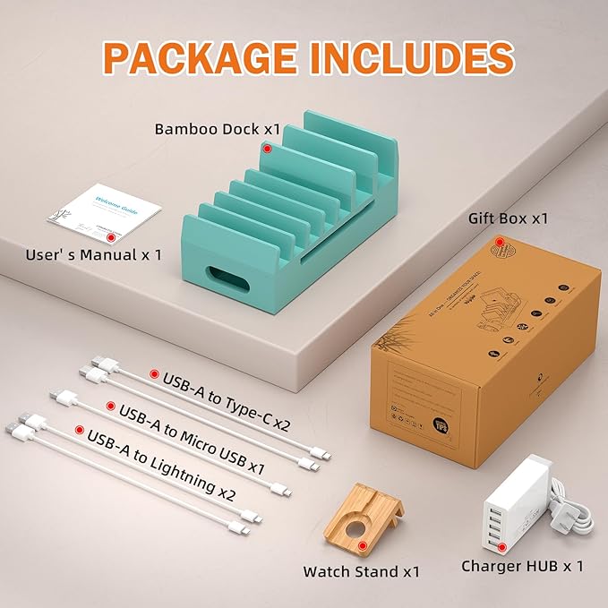 - Compatible with Multiple Devices: The bamboo charging station with Watch Dock Stand, is designed to charge up to your 7 devices simultaneously, matching to the universal cell phones, tablet, E-reader, and more devices no matter how thick case on