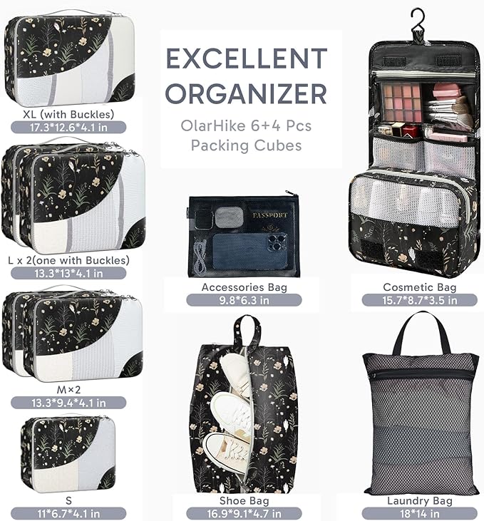 ALL INCLUDED 10 Set Durable Packing Cubes for Suitcases,OlarHike Essentials for Travel,UPGRADED Anti-Tear Stitching, NEW Improved Luggage Packing Organizers for Travel Accessories, Black Flower
