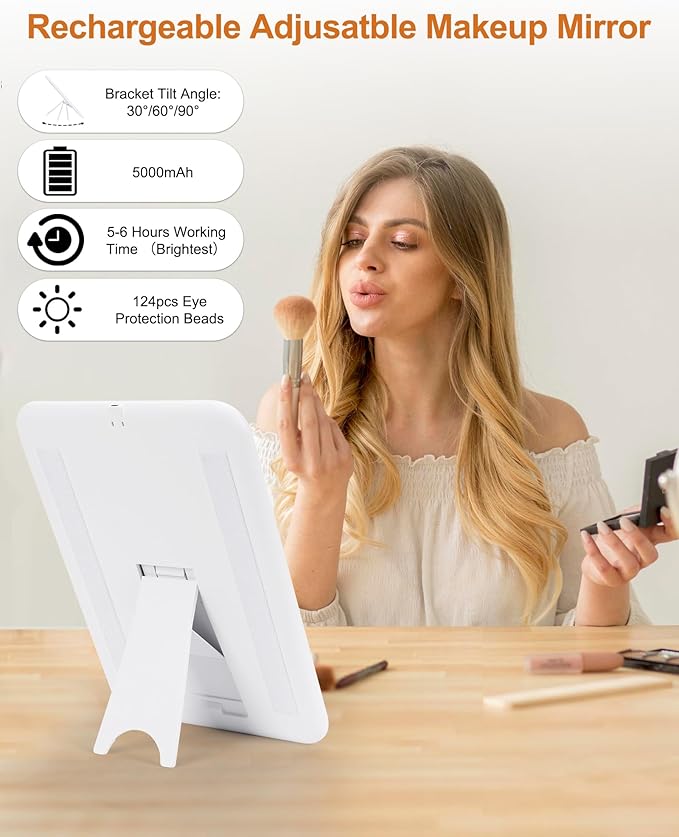 - THREE COLOR LIGHTING ADJUSTMENT: This rechargeable LED makeup mirror offers 3 color lighting: cool light, natural light and warm light, and the brightness can be adjusted freely. Ensure precise makeup application even in dim environments. The mirror comes with a stand on the back and can be used separately.