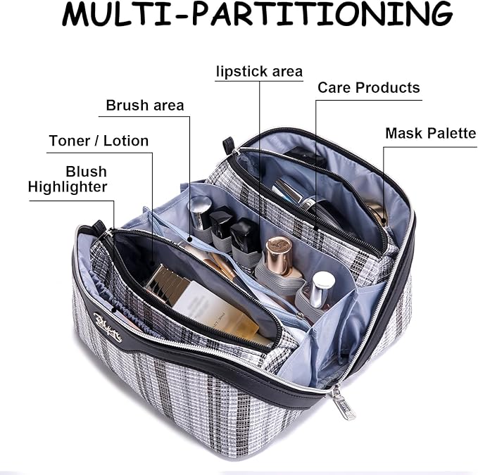- Large Capacity Cosmetic Bag: The size of travel cosmetic bag is 9.25*5.1*5 inches,fit for 8oz toner bottles and larger skincare essentials with ease.The lay-flat design makes packing effortless,keeping all your cosmetics and toiletries neatly in place.It’s perfect for your dresser,bathroom,or even on the go-packed it in your luggage for travel.