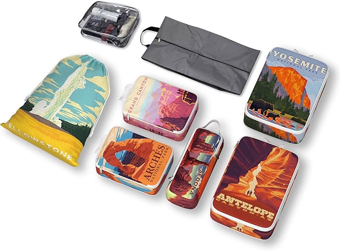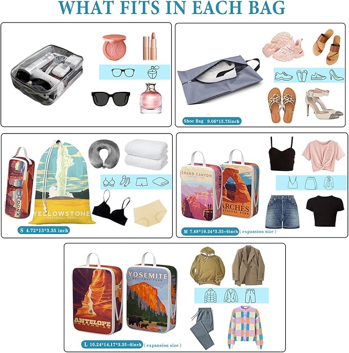 Compression Packing Cubes for Travel, 8 Set National Park Luggage Organizers, Waterproof Expandable/Compression Bags Travel Packing Cubes with Clear Toiletry Bag and Shoe Bag