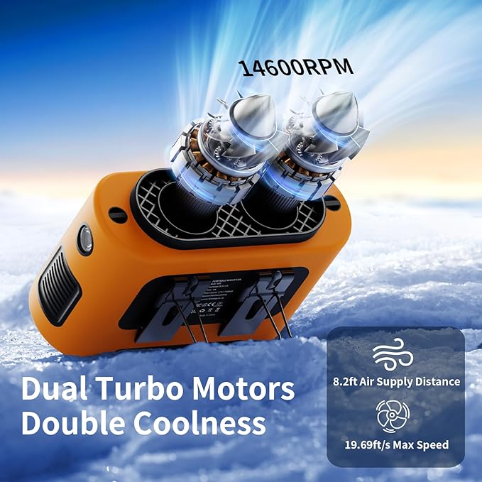 - 【Dual Turbo Motors Design】Built-in two high-speed turbo motors, making this personal fan can provide stronger airflow, which can reach a maximum speed of 14600 RPM, generating airflow of up to 26.24 ft/s with an air supply distance of 11.48 ft for quick cooling