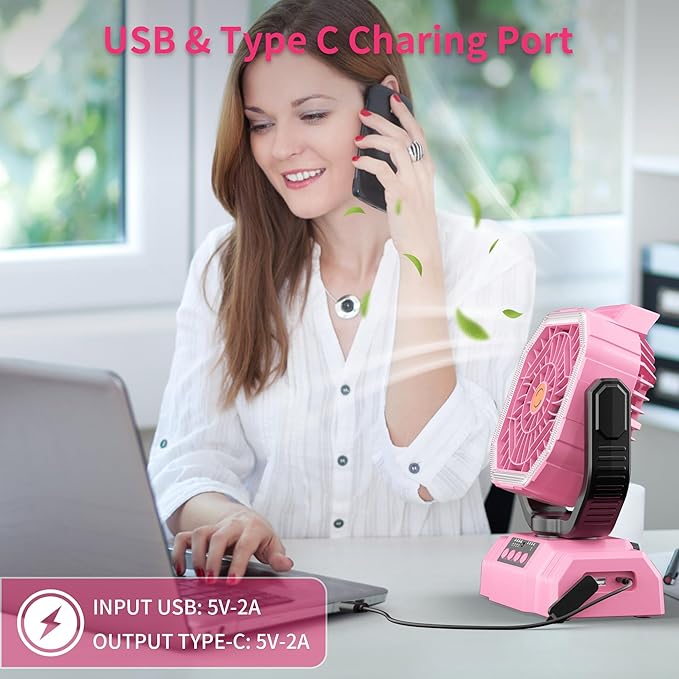- Whisper quiet & powerful airflow - Equipped with the latest brushless motor technology and ultra-thin fan blades, this portable fan rechargeable operates quietly at less than 28 dB while delivering powerful airflow. With 4 wind speed options, you can adjust the airflow in your tent for optimal comfort. The tent fan also features 3 brightness levels for the integrated LED light, making the fan suitable for bedroom, travel, camping