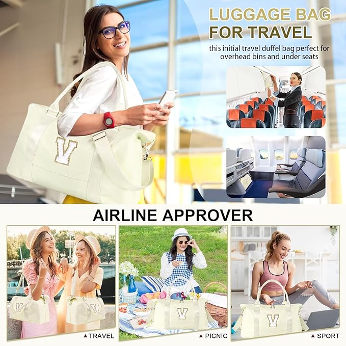 Dance Gym Duffel Bag for Teen Girls, Personalized Initial Travel Weekender Bag,Cute Overnight Carry On Duffle for Women,Sports Travel Cheer Bag,Monogram Christmas Gifts for Tween Preppy(beige-V)