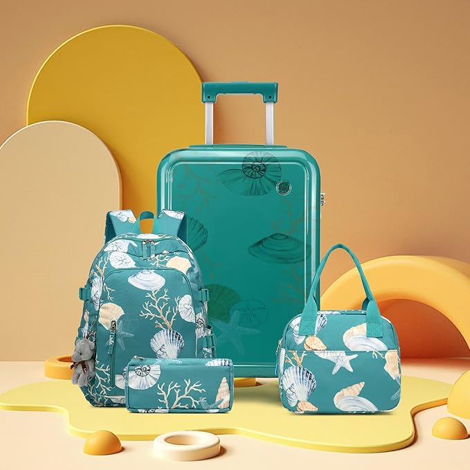 Somago 4 Piece Kid's Luggage with Backpack Set for Boys Girls Spinner 18" Hardside PC Rolling Carry on Suitcase with TSA Lock (Seashell Blue)