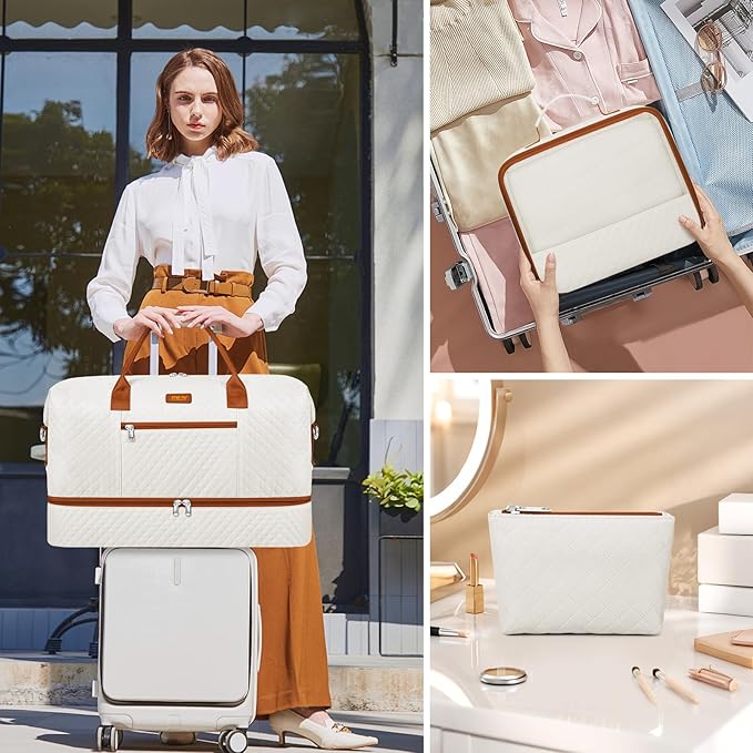 • [Perfect 3Pcs Weekender Bag Set] The travel duffel bag comes with 1 clothing storage bag, 1 toiletry bag, djustable & detachable shoulder straps and shoes compartment. This weekender bag for women is crafted with high-quality cotton and faux leather material, and paired with smooth zippers, making it durable and resistant to wear. This overnight weekend bag is perfect for your personal travel.