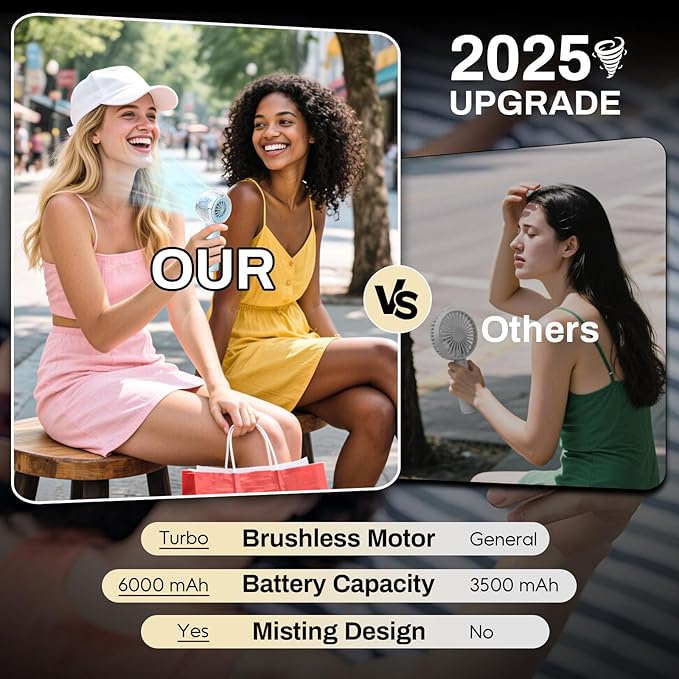 - 2025 UPGRADED TURBO FAN - Not just another portable fan. Turn the handheld fan on and the fan blows air at you. Turn on the mist and the temperature drops immediately on the air hitting you. It's like a handheld air conditioner! The mist is like a water vapor carried by the air and really makes it effective. Great for any activities where you have to be in the heat, ideal for anyone needing quick, portable relief from the heat!