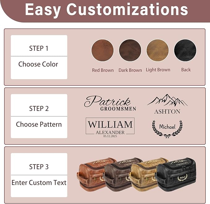 - đăTop and Front PersonalizedăCreate a unique personalized gift for men with three timeless color options and dual-sided personalization (top + front). Add names, monograms, or custom text for a bespoke touch. Expertly handcrafted with reinforced stitching, this mens personalized toiletry bag maintains tailored sophistication while organizing your daily essentials.