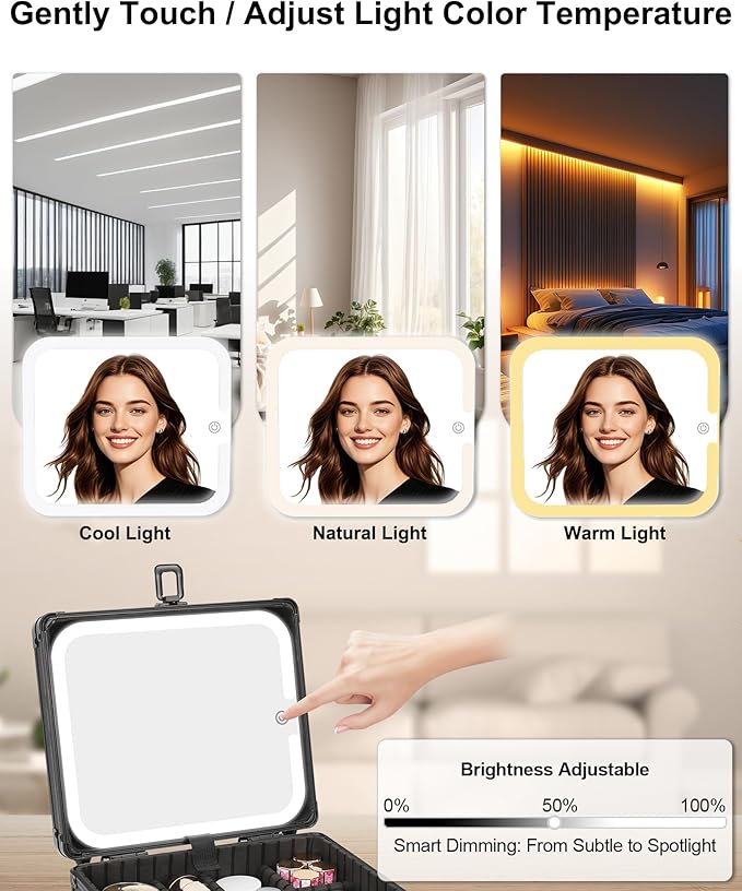 - 【Professional 3-Color Fill Light Mirror】Makeup bag with detachable velcro makeup mirror, and gently touching the switch can easily adjust color temperature between cold light, natural light, and warm light, revealing true skin & facial details, Long press to control the brightness from 0% to 100%. Widely use for sophisticated party, business attendance, or daily makeup.