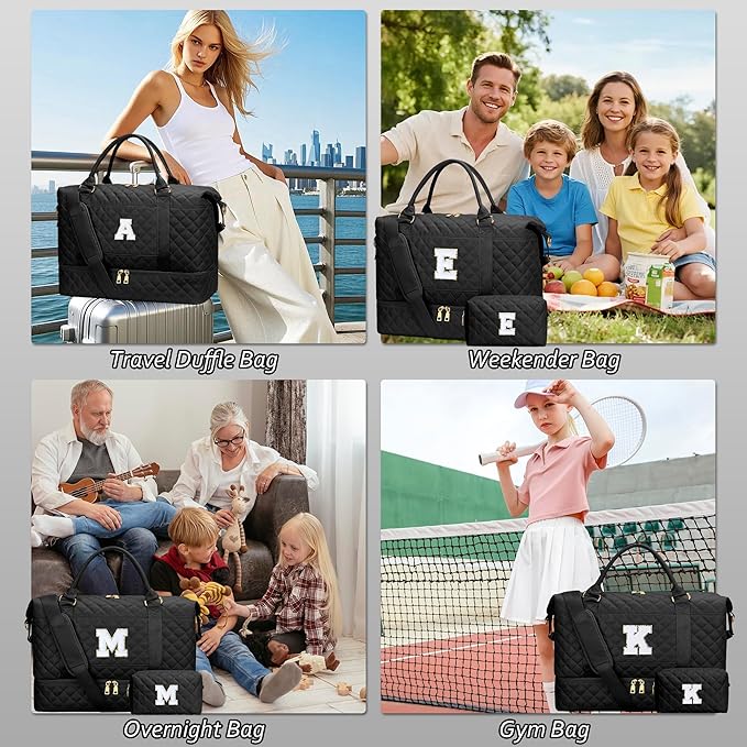 Gifts for Teens Girls Women Initial Travel Duffle Bag Quilted Weekender Carry-On Overnight with Cosmetic Bag, Gym Bag with Shoe Compartment, Black M