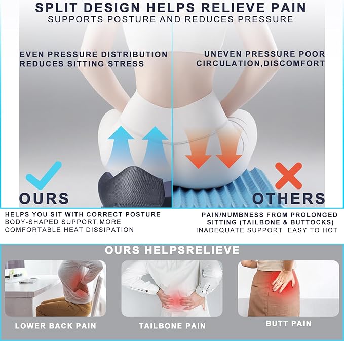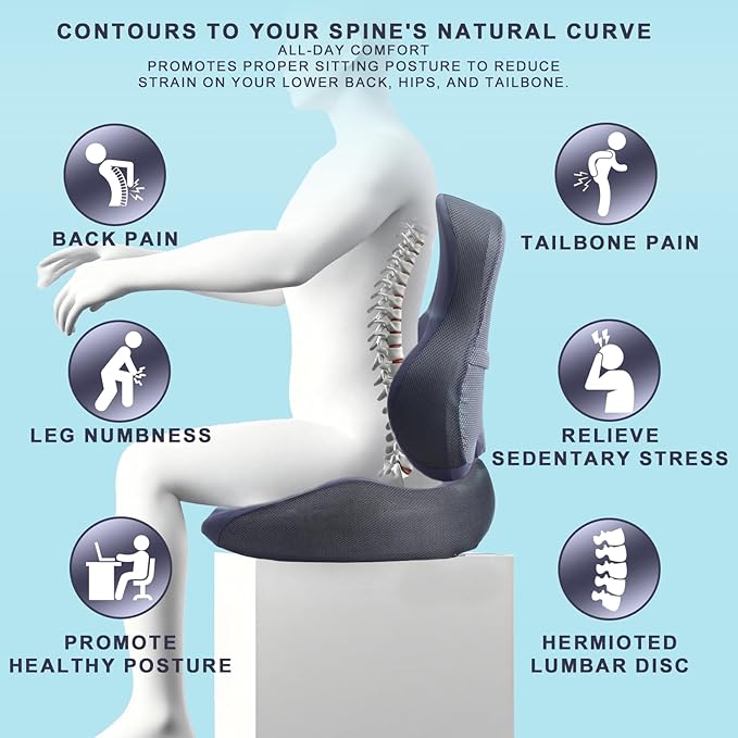 - 【Posture Improvement & Pain Relief】-Our seat cushions perfectly fits the curve of the hips and lumbar support pillows conforms to the natural curve of the spine.It adopts saddle-shaped design cradles your back,triple reinforcement provides you with better back support and maintains a healthy posture,promoting blood circulation.