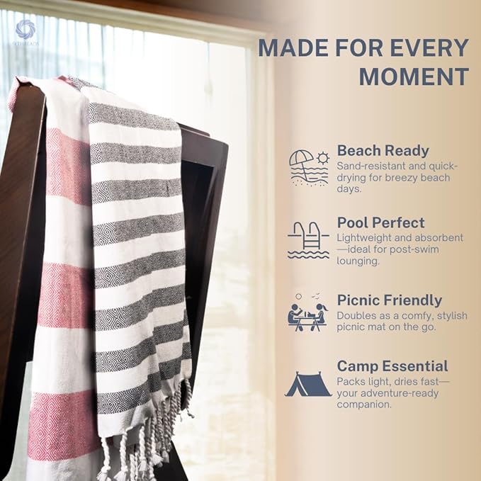 - 🌴 Sand-Free, Quick-Drying & Stylish in Every Shade: Enjoy the beach without the mess—9Threads Turkish towels are sand-resistant and fast-drying, making them your perfect companion for sun, surf, and travel. Available in vibrant, eye-catching colors and bundle options of 2, 4, or 6, they suit every style, space, and occasion—whether for family trips, bathroom upgrades, or thoughtful gifting.