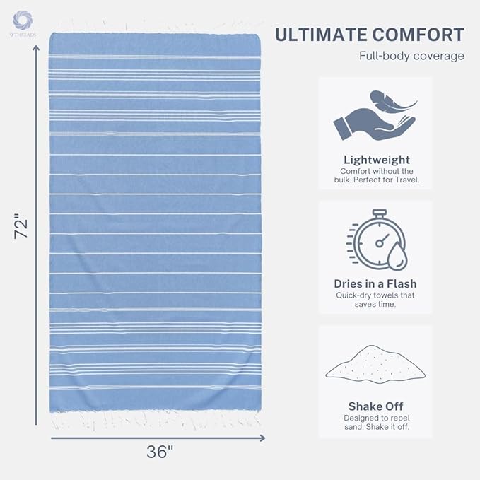 - 🌴 Sand-Free, Quick-Drying & Stylish in Every Shade: Enjoy the beach without the mess—9Threads Turkish towels are sand-resistant and fast-drying, making them your perfect companion for sun, surf, and travel. Available in vibrant, eye-catching colors and bundle options of 2, 4, or 6, they suit every style, space, and occasion—whether for family trips, bathroom upgrades, or thoughtful gifting.