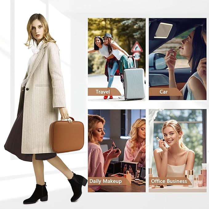 Travel Makeup Bag for Women and Makeup Artists Cosmetic Organizer Large Makeup Case,Travel Makeup Bag with Mirror 3 Color Setting,Portable Storage and Adjustable Dividers(CARAMEL COLOR)