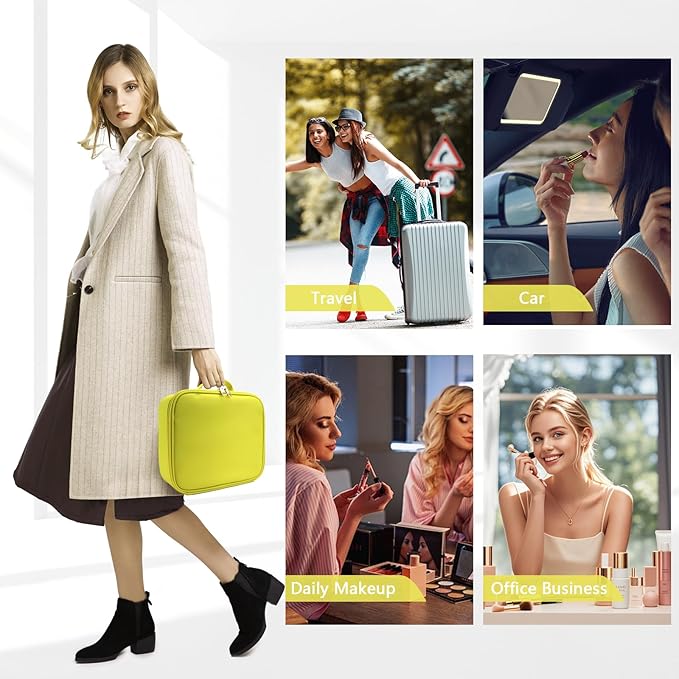 Travel Makeup Bag for Women and Makeup Artists Cosmetic Organizer Large Makeup Case,Travel Makeup Bag with Mirror 3 Color Setting,Portable Storage and Adjustable Dividers(yellow)