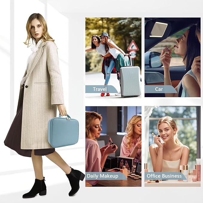 Travel Makeup Bag for Women and Makeup Artists Cosmetic Organizer Large Makeup Case,Travel Makeup Bag with Mirror 3 Color Setting,Portable Storage and Adjustable Dividers(baby blue)