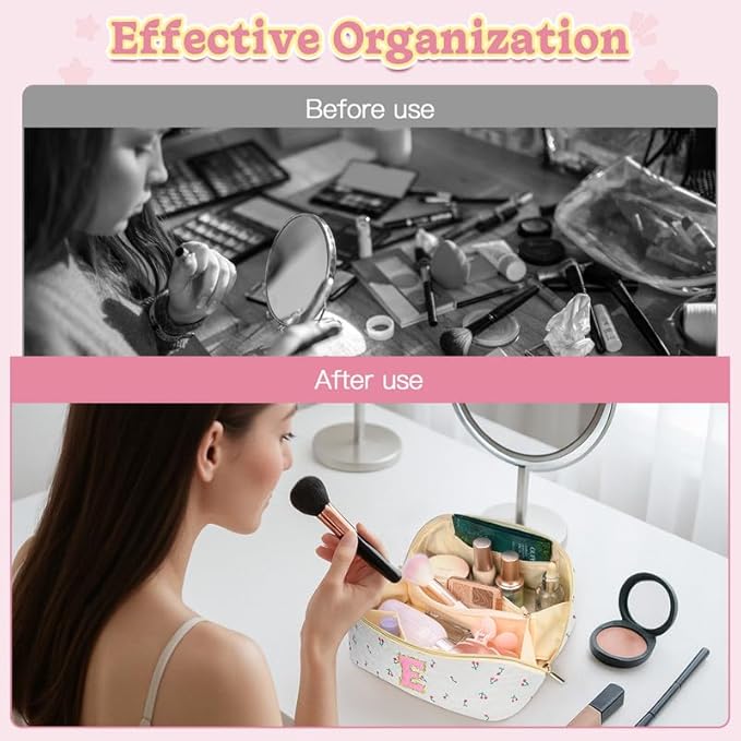 - Large-Capacity Makeup Organizer: The letter makeup bag adopts a multi-compartment design, 180°opening design, with elastic pockets and zipper compartments, which can keep your cosmetics organized and allowing easy access to all your items.