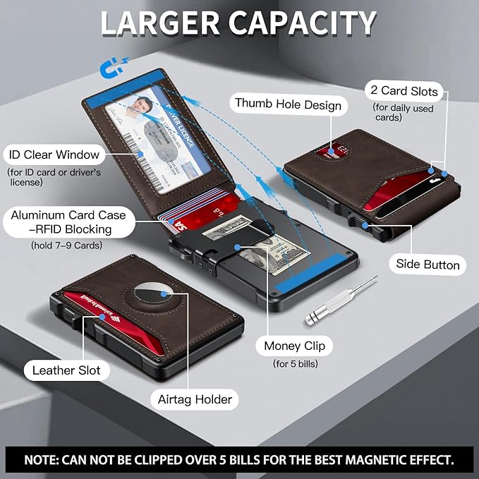 - MINIMALIST BUT LARGE CAPACITY - Our minimalist wallet for men with air tag holder fits effortlessly in pockets without bulk, yet holds 12+ cards, cash and AirTag securely. A money clip on the inside of the card holder helps you store cash(For the best magnetic effect, please DO NOT clip over 5 bills to the money click inside).