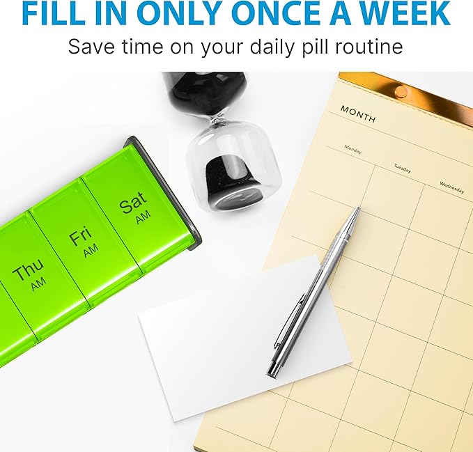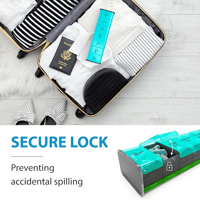 - Dual-Color Design – This weekly medicine pill organizer 2 times a day features a practical green and blue color split, simplifying pill organization. Large, clear labels on each compartment ensure effortless medication management throughout the week
