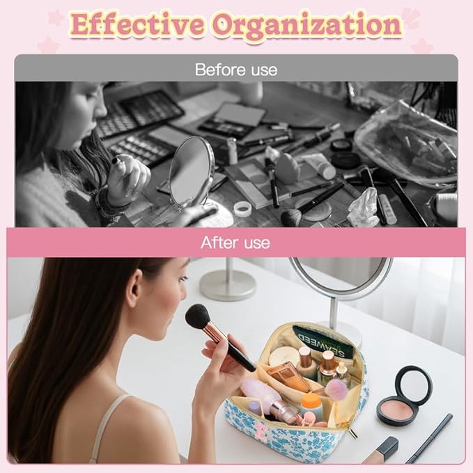 - Large-Capacity Makeup Organizer: The letter makeup bag adopts a multi-compartment design, 181°opening design, with elastic pockets and zipper compartments, which can keep your