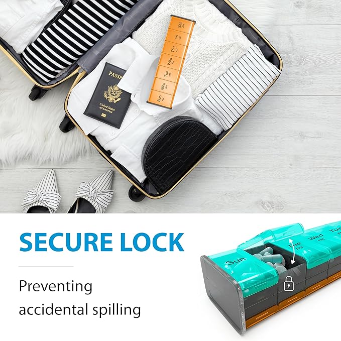 - Secure Lock – This XL supplement container AM PM has a strong locking system that prevents accidental spills, keeping med secure. Perfect for travel or carrying in your bag