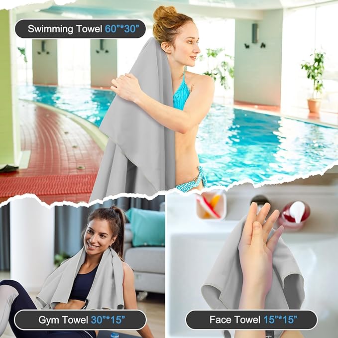 Quick Dry Travel Towel, 3 Sizes 1 Pack Camping Microfiber Towel, Lightweight Fast Drying Towels Set 60"x30", 30"x15", 15"x15" w/Bag for Gym, Beach, Hiking, Swimming, Grey