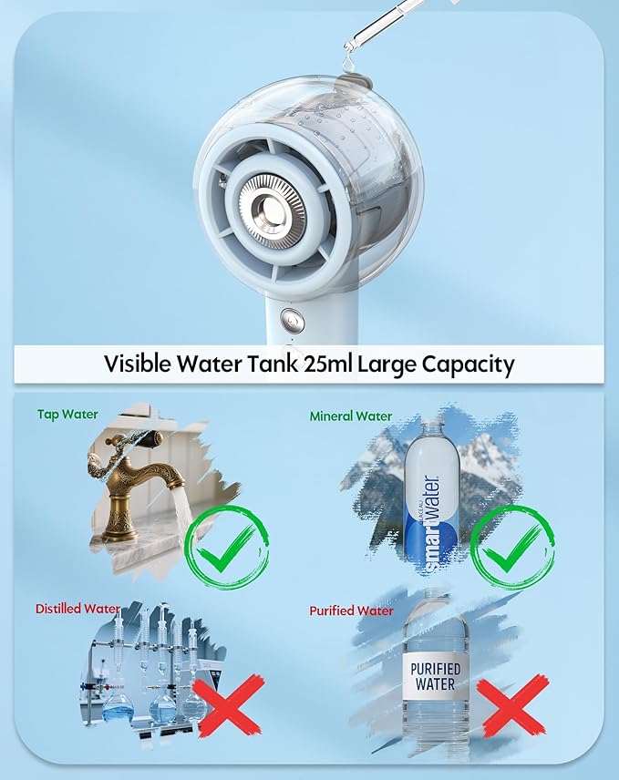 - Upgraded Misting Technology & 25mL Visible Water Tank: Features a transparent, leak-proof 25mL water tank (mineral water recommended for a finer mist) and an enhanced nozzle that delivers 30% more mist volume for rapid cooling. The smart 10-minute mister auto-shutoff of the misting fan portable protects battery life and prevents overuse, while its lightweight design ensures instant, sweat-free relief anywhere—indoors, outdoors, or on the go. Stay refreshed in seconds, even in peak summer heat
