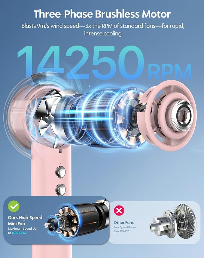 - High-Speed 14250 RPM Motor & Nano-Misting Spray: Engineered with a 6-blade turbine and powerful three-phase brushless motor, this misting fan blasts 9m/s wind speed—3x the RPM of standard fans—for rapid, intense cooling. Nano-mist technology emits ultra-fine droplets that deliver instant refreshment without dampness, making the handheld turbo fan ideal for instant relief during hikes, commutes, sports, or scorching summer days. Stay cool, comfortable, and ready for adventure—anywhere, anytime