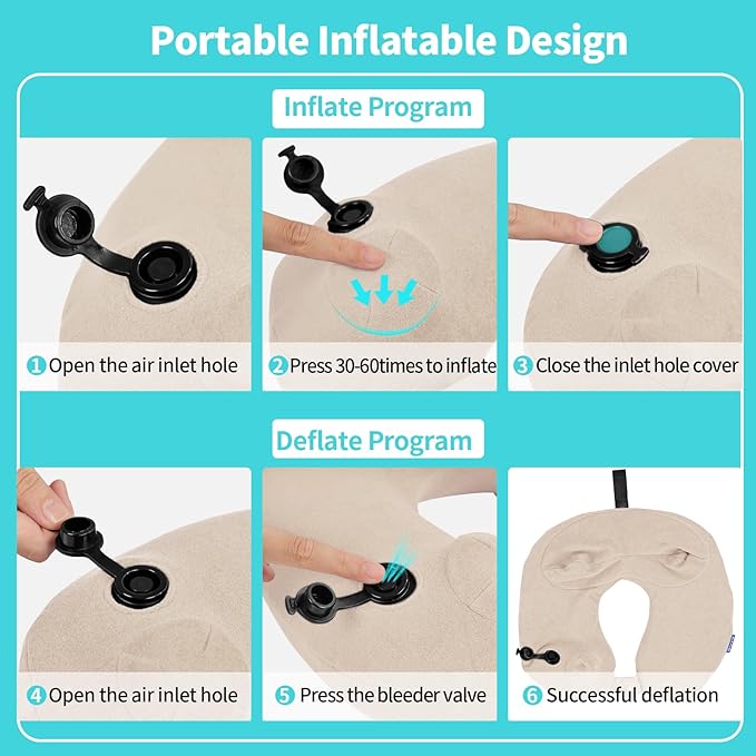 - 【Effortless Inflation – No Blowing Required】Simply press the built-in pump repeatedly until you reach your desired firmness—no need to blow into it. Deflation is just as quick, taking only 10-20 seconds to flatten and store. The adjustable front clasp allows you to customize the fit, making it suitable for travelers of all sizes.