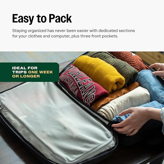 - EASY TO PACK: This convertible travel bag features a front-loading, suitcase-style opening for easy packing, plus a separate compartment a laptop. Two quick-access front pockets keep your essentials close by.
