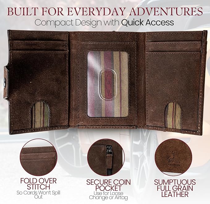 - Durable Crazy Horse Leather: Crafted from high-quality full-grain cowhide, this trifold wallet offers a perfect balance of rugged strength and refined style. Made to last, it will develop a luxurious distressed look and feel as it ages.