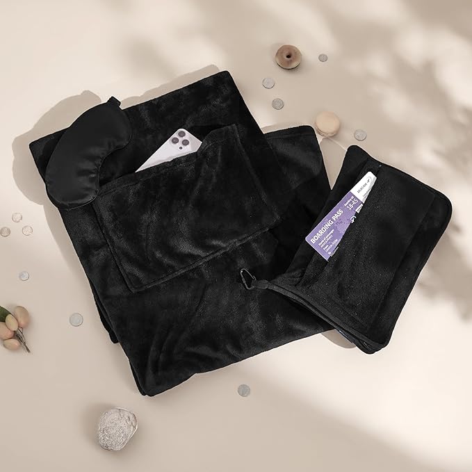 Bedsure Travel Blanket Airplane Compact with Storage Bag, Packable Blanket with Eye Mask, Lightweight 2-in-1 Travel Essentials, Functioned as Pillow for Airplane Comfort and Warmth, Black