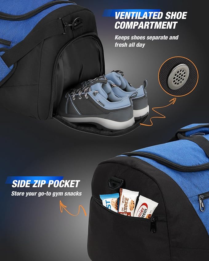 Gonex Gym Duffel Bag with Shoe Compartment Wet Pocket, Large Capacity Sports Duffle Bag for Men Women, Workout & Travel Bag with Multiple Pockets, Black/Blue, Medium (60L)