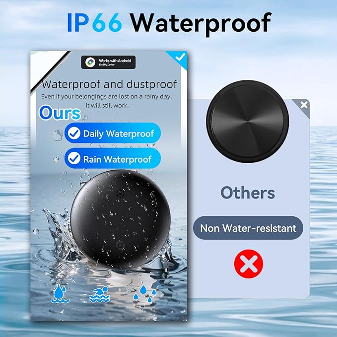 - ✅WATER-RESISTANT & REPLACEABLE BATTERY: With its impressive IP66 waterproof rating, this Google tracker is designed to withstand water splashes, rain, and even brief submersion. Google find trackers comes with a replaceable battery that lasts an impressive year. The battery life is good, even in a cold or hot weather.
