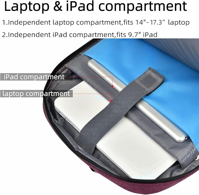 - COMPARTMENT CAPACITY & POCKETS:Separate laptop compartment fits 17/15/14/13 Inch Macbook/Laptop.Separate compartment Fits Maximum 9.7” iPad.Main compartment roomy for tech electronics accessories,3-5 days clothing,5 A4 Books.Front compartment with 2 Pockets for power Bank and Shaver,2 Pen pockets and key fob hook.Pocket for socks and gloves.Front hidden zipper pocket fits papers.2 mesh pockets for water bottle and compact umbrella.Strap pocket fits bus card and Metro Card,One glasses hold strip.