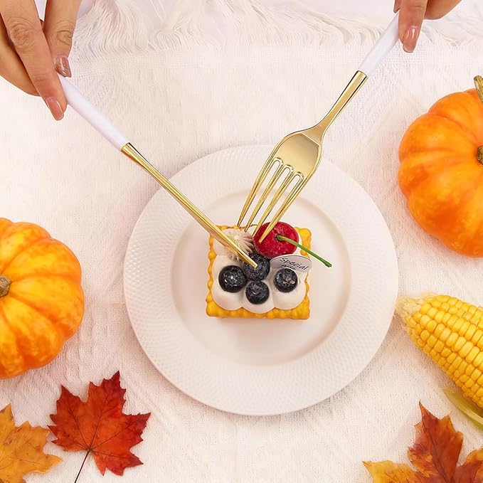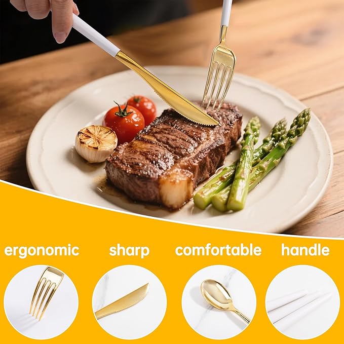 - **Versatile Use**: This gold disposable utensils is not just for special occasions; it's ideal for picnics, barbecues, and everyday meals. Our disposable dinnerware set are perfect for any occasion, providing a seamless blend of style and practicality that meets your dining needs.