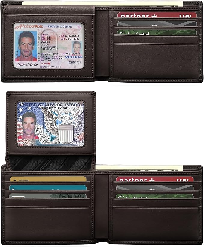 - Dual Flip-ID Quick Access: This bifold wallet features two reversible ID windows, allowing instant visibility of licenses or ID cards from either side. Both card holder windows rotate smoothly for single handed access. Maintains card security while reducing wear from frequent removal in your wallet