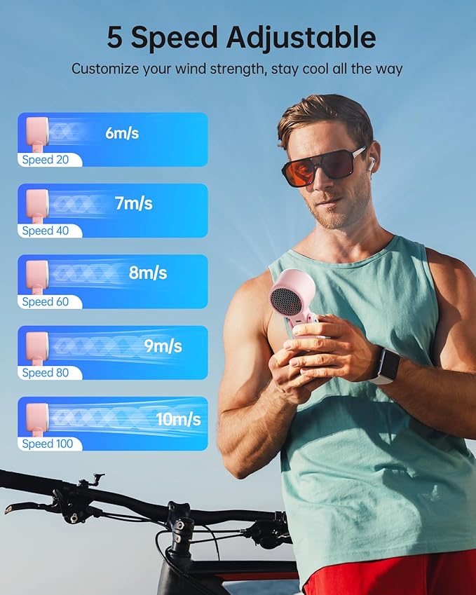 - 5 Speeds & Whisper-Quiet: Customize your comfort with 5 adjustable speeds- gentle for light flutter, or max power for serious cooling. Despite its powerful performance, this personal fan operates quiet that can keep you refreshed without disturbing conversations or work.