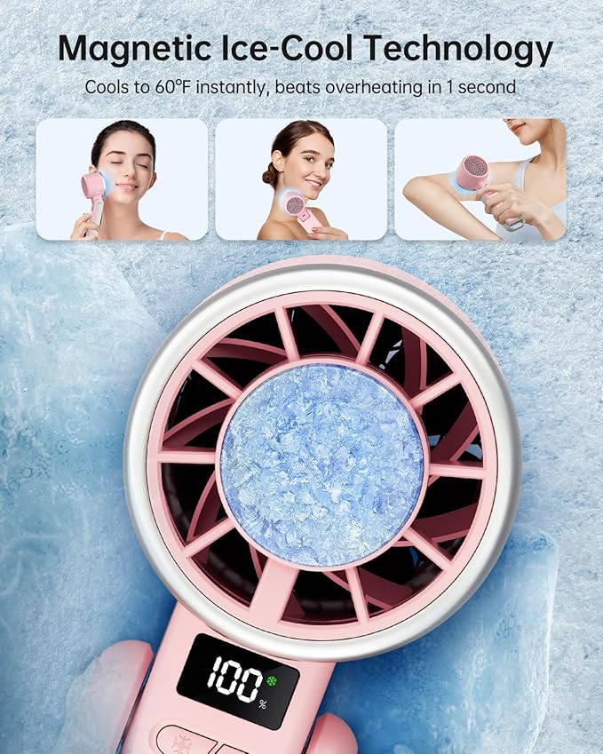 - One-Touch Ice Cooling Magic: Activate the ice cooling pad to feel immediate chill—dropping to 60°F in seconds! This handheld fan is perfect for instant relief on cheek, neck, back, or forehead when the heat overwhelming. Exclusive innovation for faster, deeper refreshment.