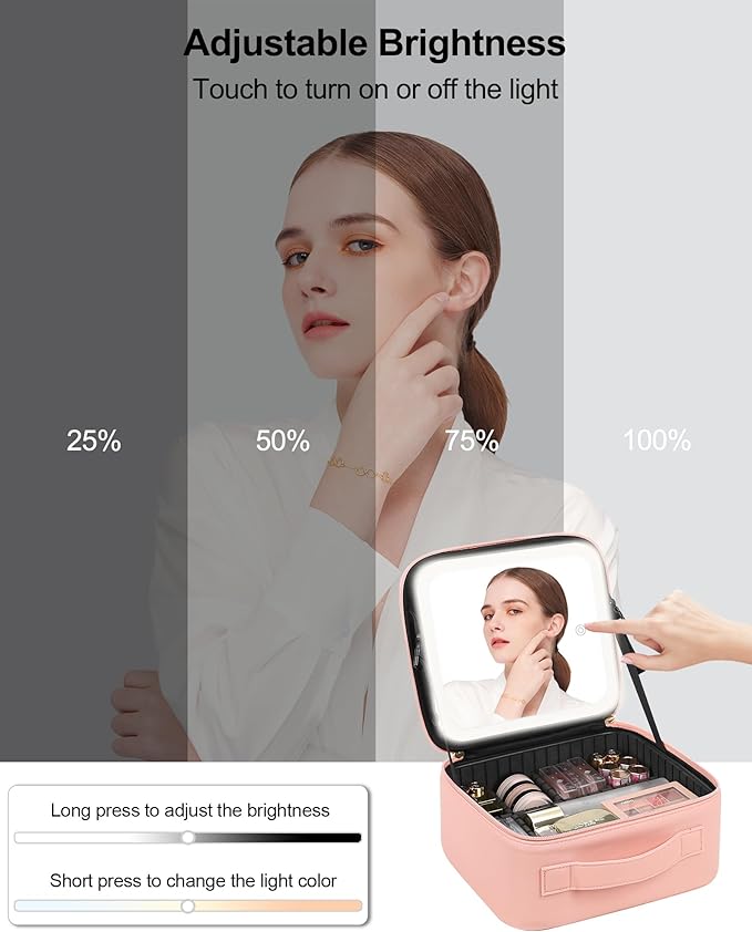- USB Rechargeable Makeup Mirror: New generation makeup case design with LED makeup mirror, with cold white / natural / warm three-tone settings, and the brightness can be adjusted 0%-100%, which can perfectly meet your different makeup needs and make your makeup more delicate.