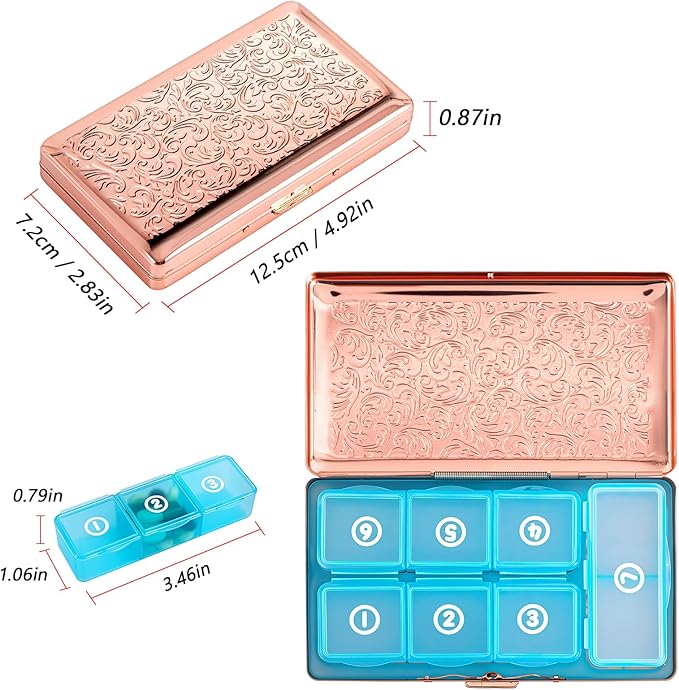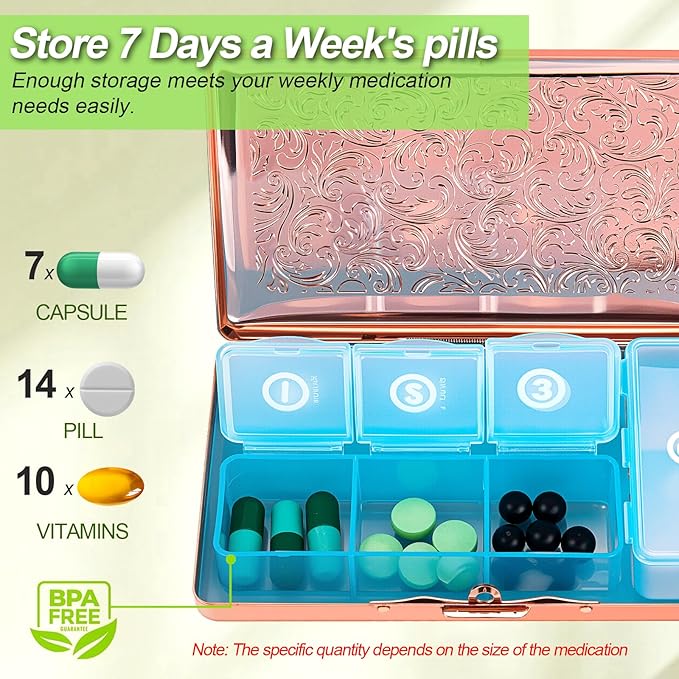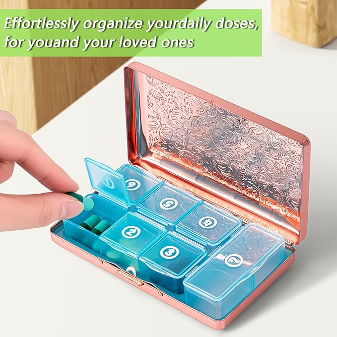 - 4.Lightweight & Portable: Constructed with robust metal stamping, this lightweight **travel pill organizer** is perfect for on-the-go use. Easily fit it into your bag for effortless medication access anytime, anywhere.