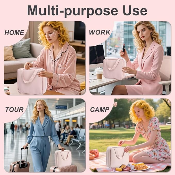 - 【Maximized Multi-Compartment Organization】 Designed with four connected dividers and three spacious compartments, this bag provides dedicated zones for cosmetics, skincare, and tools. The main compartment features a waterproof TPU film lining to prevent liquid leaks, while elastic bands secure bottles and jars upright. Three distinct sections allow you to separate creams from powders.Perfect for travel, the waterproof design and elastic straps keep essentials organized and safe from bumps, making it unnecessary to carry extra pouches or pockets.