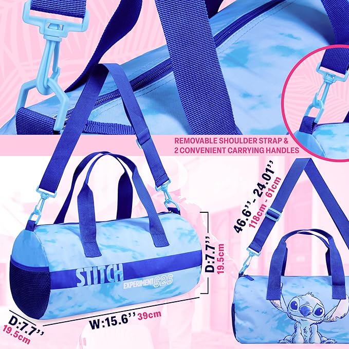 Disney Stitch Kids Duffel Bag, 15x8” Small Travel Bag with Adjustable Strap for Gym, Sports, Overnight Duffle, School Essentials, Gifts for Kids (Blue Stitch)