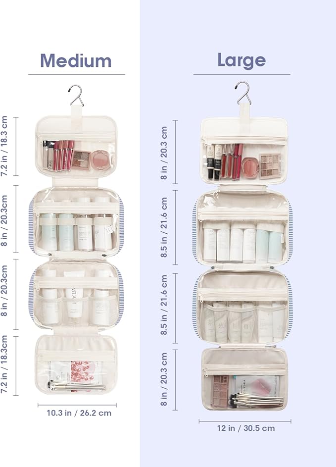 - LARGE VERSION - Fold size 12"x9"x5.5”/30.5x22x13 cm. We launch larger version to meet large-capacity, which you may choose large or medium size based on your needs. It could easily fit full-size travel essentials like shampoo & conditioner, lotion, face wash, toothpaste, toothbrushes, hair brush and daily makeups