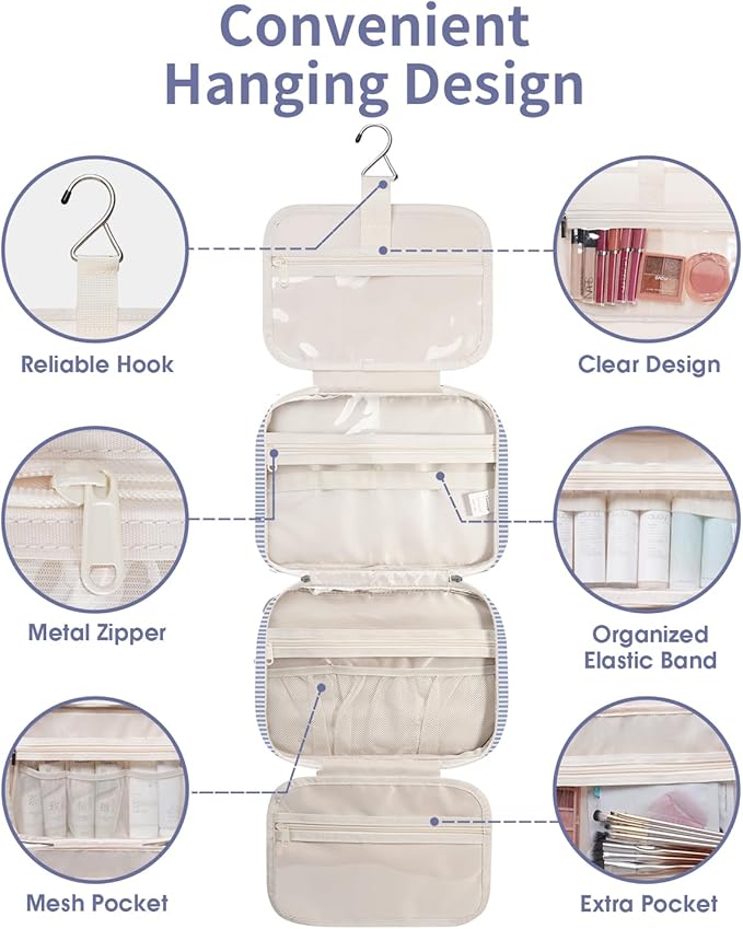 - NOT BULKY DESIGN - Large Capacity yet compact design, weighing 16 ounces. large metal hook allows hanging the toiletry case from towel rack, coat hook or wherever is available, making your toiletries and cosmetics displayed well for easy access
