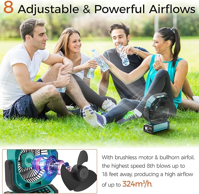 - Long-lasting Battery: The camping fan features a 20000mAh built-in battery with up to 112 hours of runtime on the lowest wind speed. Equipped with USB output ports for charging phones or other devices during power outages or outdoor adventures